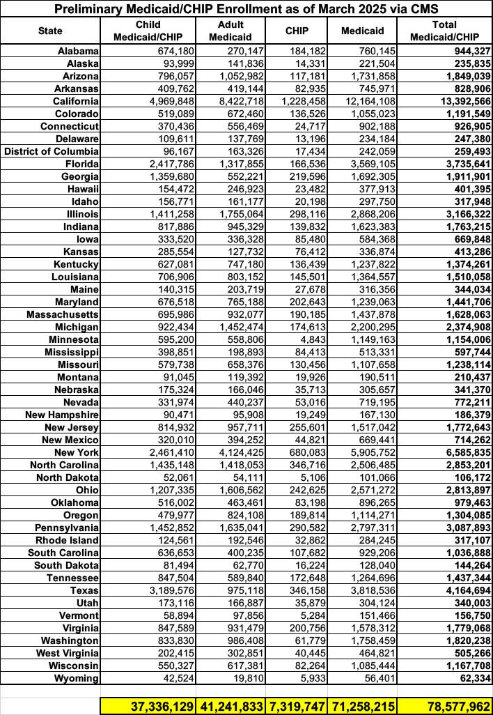 Trump Regime posts claimed March 2025 Medicaid/CHIP enrollment report: 78.6M, down 173K from January