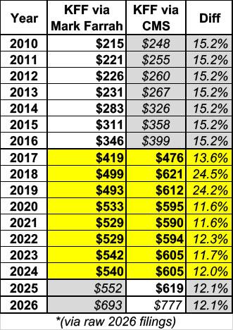As you can see, the CMS averages are consistently higher than the Mark Farrah averages, ranging from 11.6% - 24.5% higher for the years covered by both data sets.