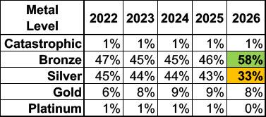 - More individuals enrolled in plans with higher out-of-pocket costs – Nearly 60 percent of enrollees selected Bronze plans for 2026, compared to just under 50 percent in 2025. Silver plans, which have higher monthly premiums but lower out-of-pocket costs for the consumer, saw enrollment fall by approximately 30 percent.