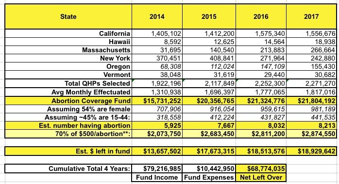 An actuary friend of mine noted at the time that from a pure cost perspective, $1 per member per month added up to a lot more money being put into these segregated funds than would ever actually be used to pay for abortions. I started running the numbers and came up with a very rough guesstimate; at the time, I estimated that the amount of actual premium revenue added worked out to something like $79 million from 2014 - 2017. I then did some more calculations and concluded that of that, perhaps $10.4 million was actually used to pay for abortion services for enrollees in those plans: