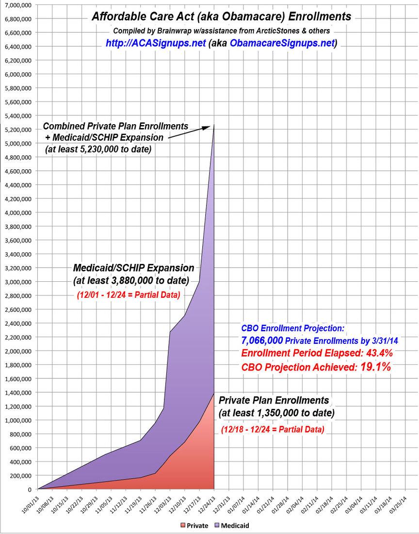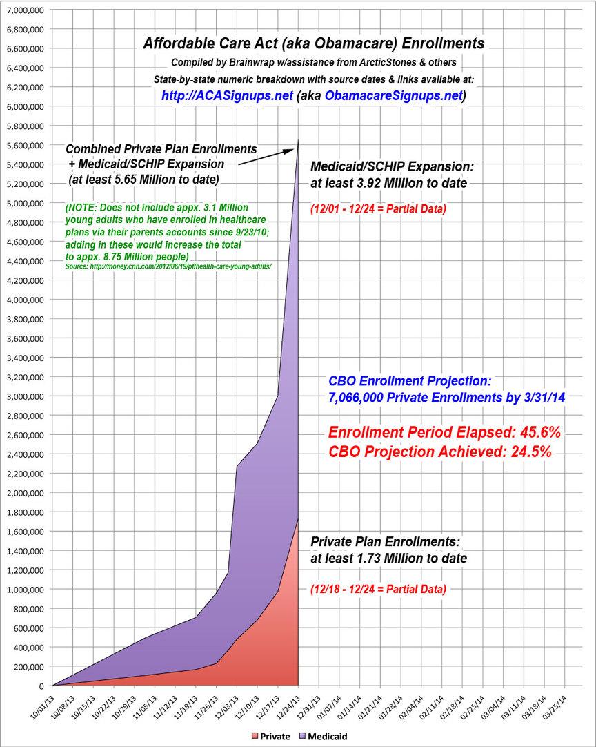 OK, after the insanity of the past few days in terms of both the ever-shifting January enrollment deadline (changing from 12/15 to 12/23 and then 12/24 Federally; ranging from 12/23 to 12/24 to 12/27 to, amazingly, 12/31 for some of the State exchanges) as well as on a personal level (Forbes, the Washington Post and NY Magazine are now citing ACASignups.net as a trusted source), actual updates to the enrollment tally have actually been kind of quiet the past day or so.