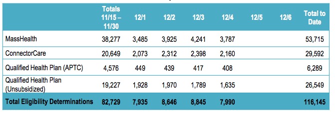 First, we have today's daily MA Health Connector Dashboard report, which states that there have been 148,453 QHP determinations thorugh yesterday (12/29). Assuming 50% of these have selected plans, that's around 74,200 QHP selections to date. In addition, the 134,803 Medicaid (MassHealth) enrollments are already locked in.