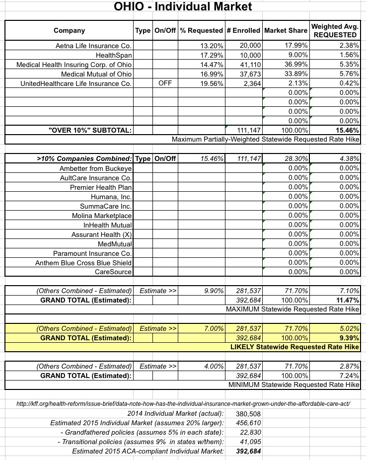 As explained in the first link above, I've still been able to piece together rough estimates of the maximum possible and mid-range requested average rate increase for the Ohio individual market: