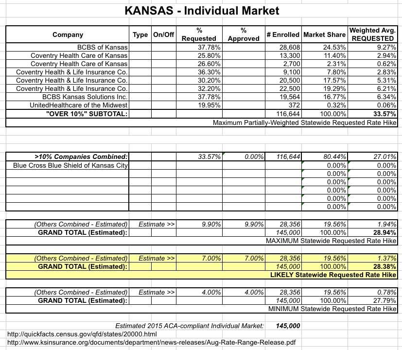 Again, the full explanation is included in the Missouri estimate, but to the best of my knowledge, it looks like the companies requesting rate increases higher than 10% come in at a weighted 13.4% increase, but only make up about 50% of the total ACA-compliant individual market, with several other companies (Oscar, AmeriHealth & possibly other off-exchange only companies) requesting increases of less than 10% (or possibly even decreases in some cases) and making up the other half.