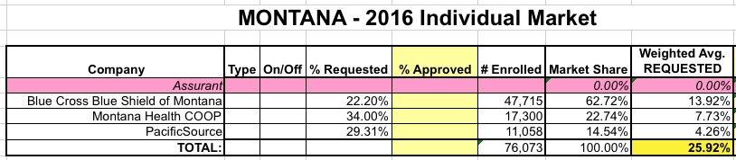 Montana's Dept. of Insurance website doesn't really provide the actual rate filings (or if it does, I can't find them), but it does include this handy chart laying out every carrier offering individual policies in the state (there's only four of them, and one, Assurant, just went belly-up this past spring). That leaves just three companies to track: BCBS of Montana, Montana Health COOP and PacificSource.