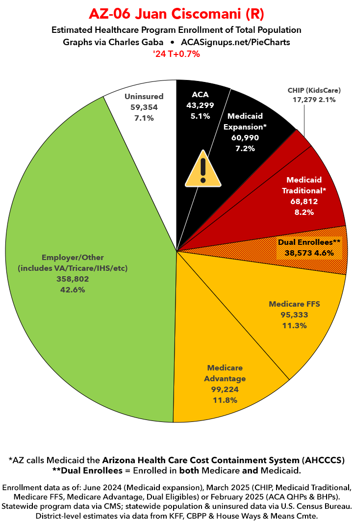 UPDATE 7/1/25: I've updated the web versions of the graphics with the most up-to-date enrollment data I have access to. The black sections w/the ⚠️ symbol are those most at risk of losing healthcare coverage due to H.R. 1, the "One Big Beautiful Bill Act" (aka the #MAGAMurderBill).