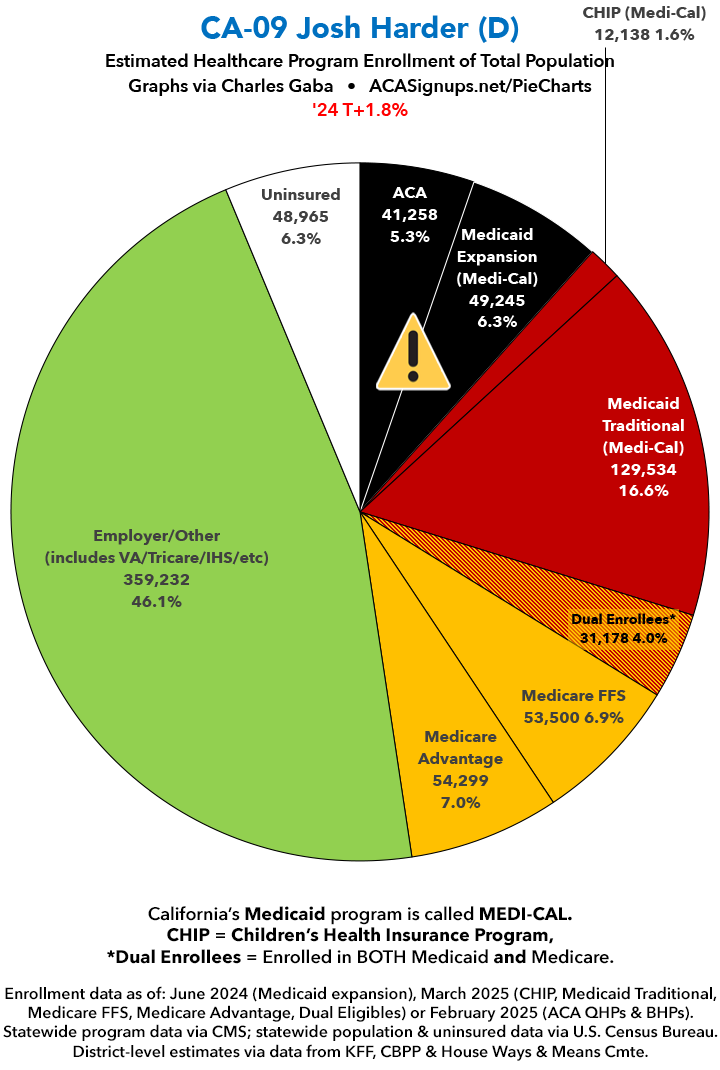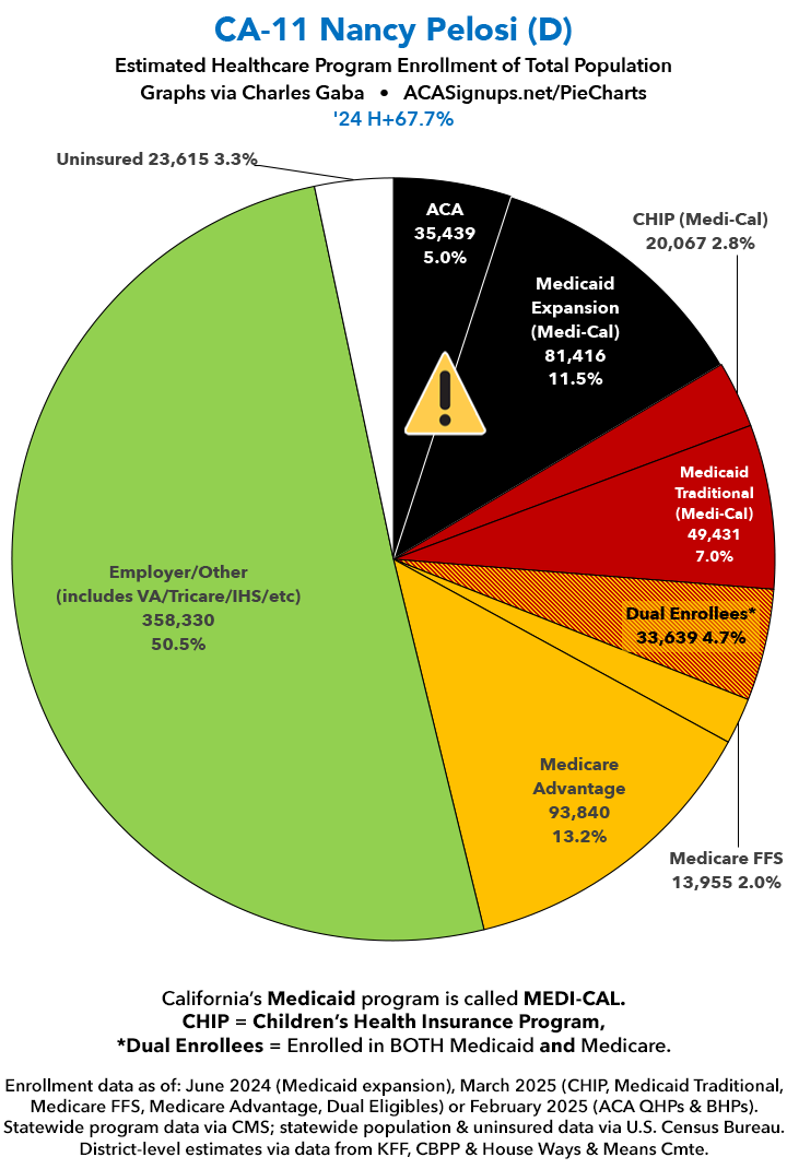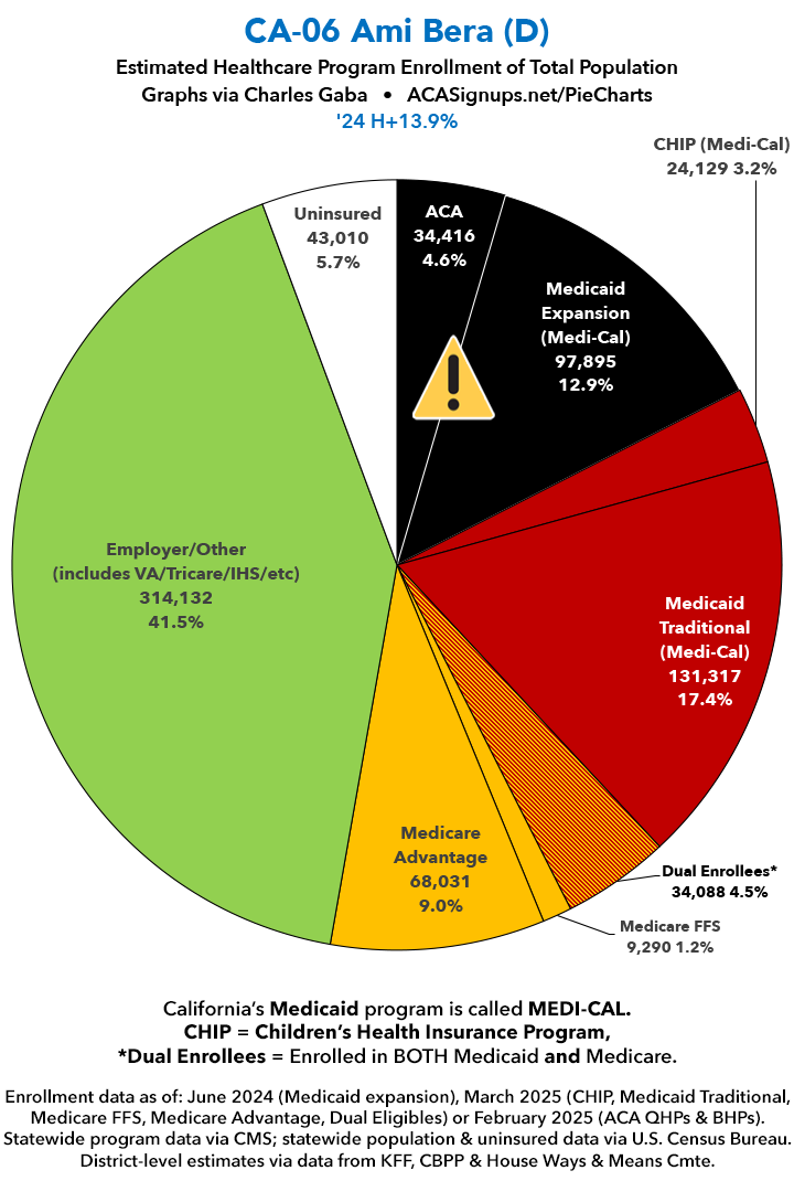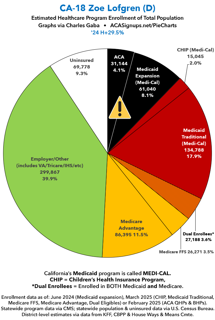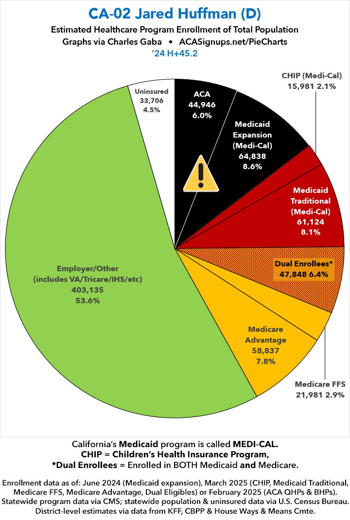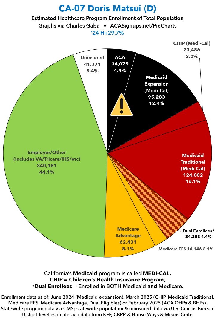 UPDATE 7/1/25: I've updated the web versions of the graphics with the most up-to-date enrollment data I have access to. The black sections w/the ⚠️ symbol are those most at risk of losing healthcare coverage due to H.R. 1, the "One Big Beautiful Bill Act" (aka the #MAGAMurderBill).