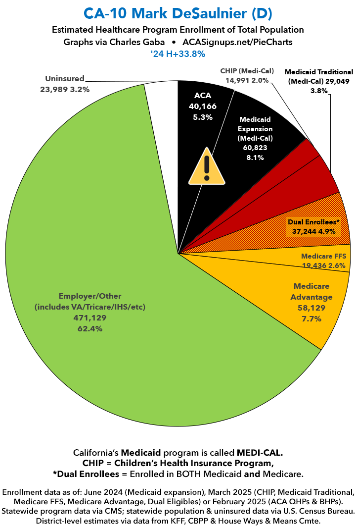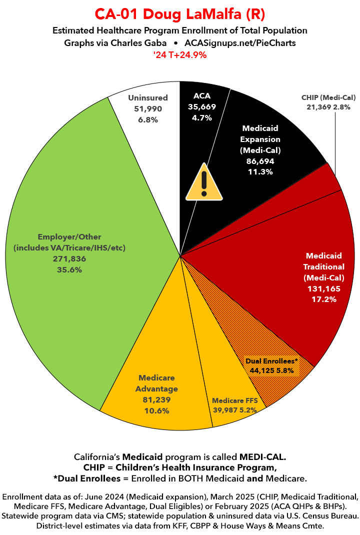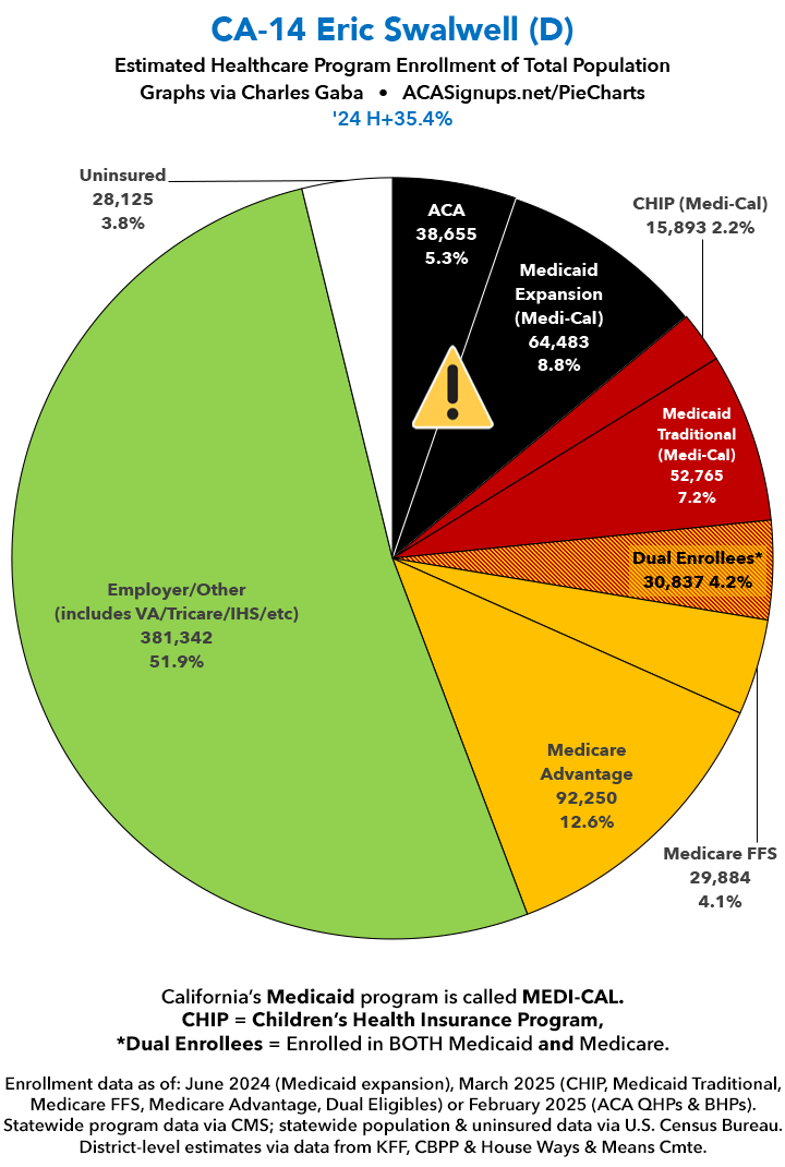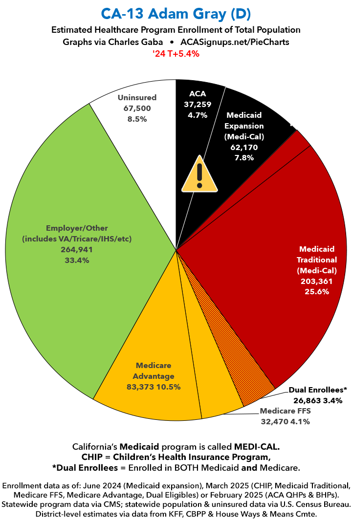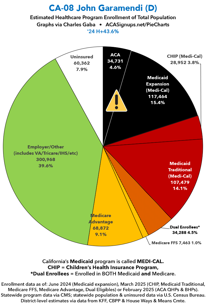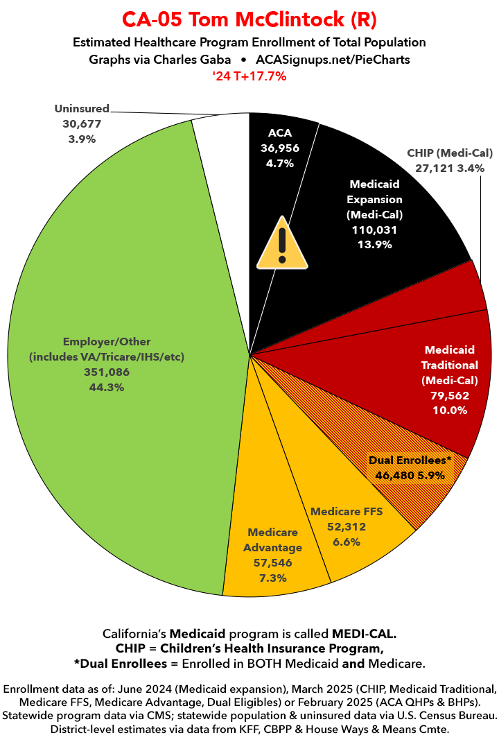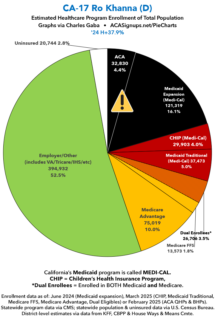 UPDATE 7/1/25: I've updated the web versions of the graphics with the most up-to-date enrollment data I have access to. The black sections w/the ⚠️ symbol are those most at risk of losing healthcare coverage due to H.R. 1, the "One Big Beautiful Bill Act" (aka the #MAGAMurderBill).