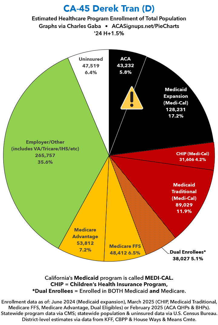 UPDATE 7/2/25: I've updated the web versions of the graphics with the most up-to-date enrollment data I have access to. The black sections w/the ⚠️ symbol are those most at risk of losing healthcare coverage due to H.R. 1, the "One Big Beautiful Bill Act" (aka the #MAGAMurderBill).