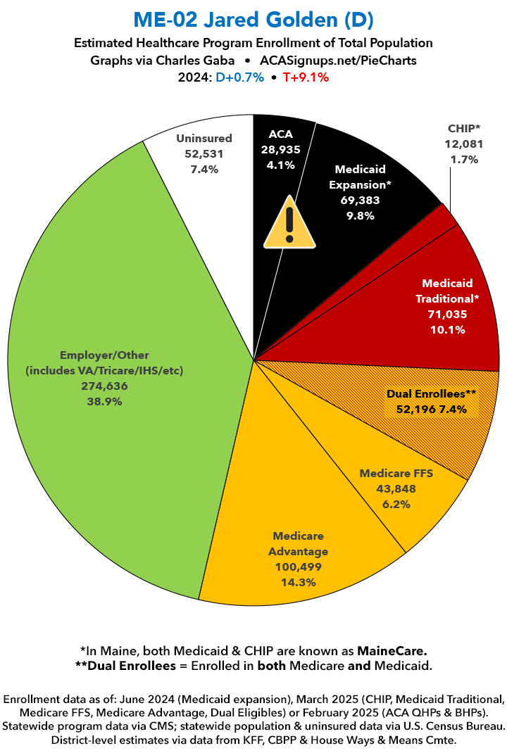 UPDATE 7/16/25: I've updated the web versions of the graphics with the most up-to-date enrollment data I have access to. The black sections w/the ⚠️ symbol are those most at risk of losing healthcare coverage due to H.R. 1, the "One Big Beautiful Bill Act" (aka the #MAGAMurderBill).​​​​​