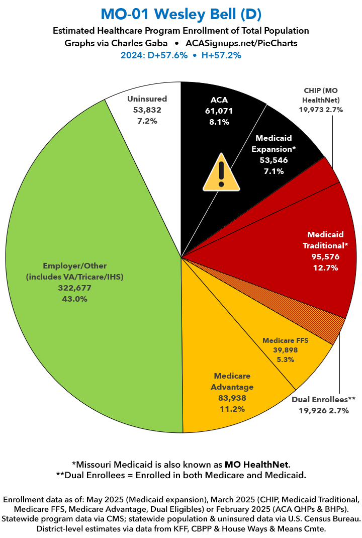 UPDATE 7/6/25: I've updated the web versions of the graphics with the most up-to-date enrollment data I have access to. The black sections w/the ⚠️ symbol are those most at risk of losing healthcare coverage due to H.R. 1, the "One Big Beautiful Bill Act" (aka the #MAGAMurderBill).