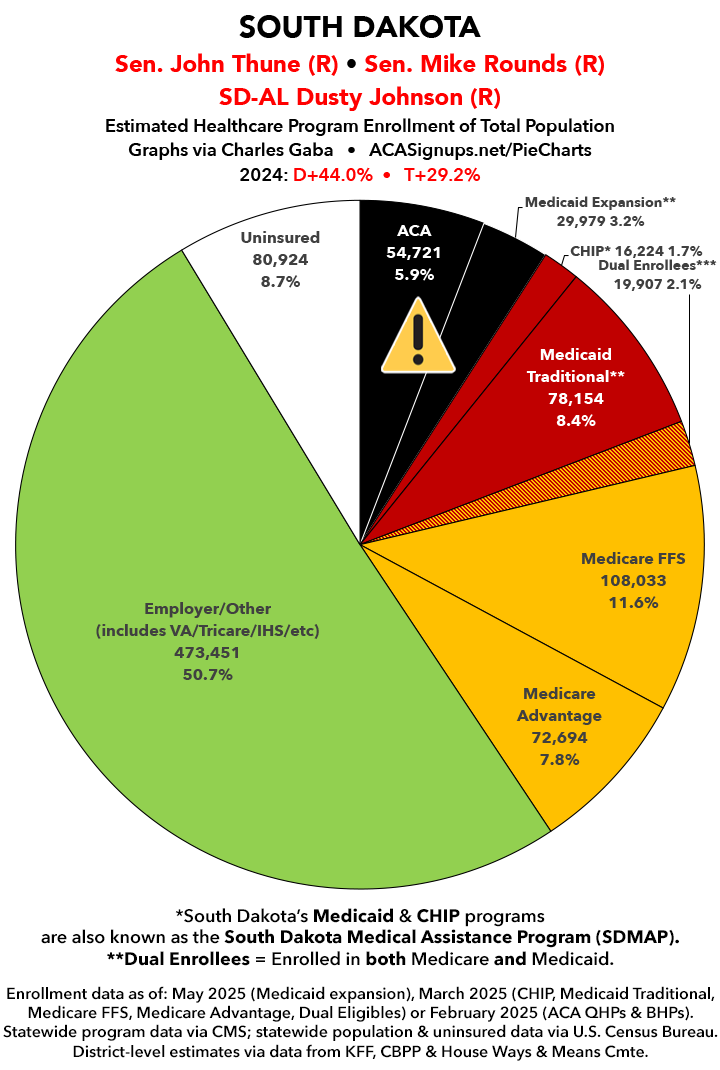 UPDATE 7/11/25: I've updated the web versions of the graphics with the most up-to-date enrollment data I have access to. The black sections w/the ⚠️ symbol are those most at risk of losing healthcare coverage due to H.R. 1, the "One Big Beautiful Bill Act" (aka the #MAGAMurderBill).