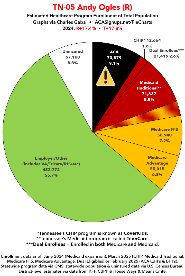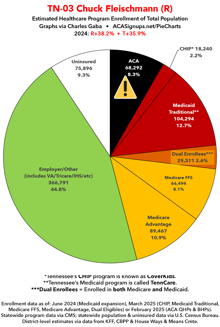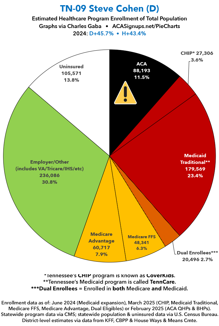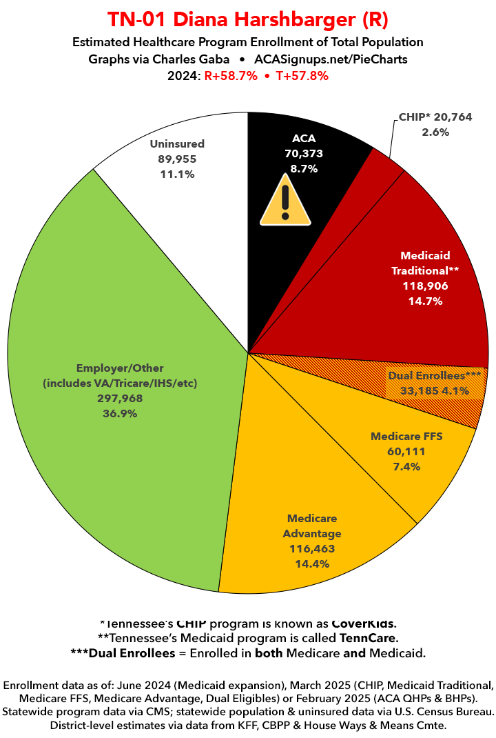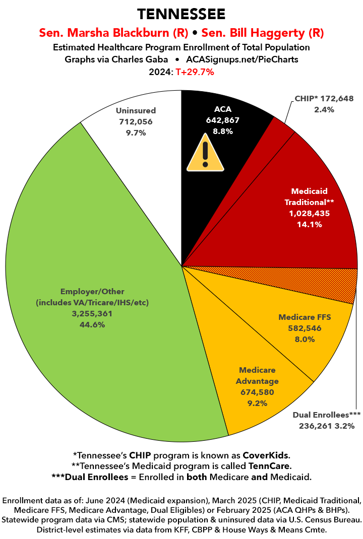 UPDATE 7/11/25: I've updated the web versions of the graphics with the most up-to-date enrollment data I have access to. The black sections w/the ⚠️ symbol are those most at risk of losing healthcare coverage due to H.R. 1, the "One Big Beautiful Bill Act" (aka the #MAGAMurderBill).