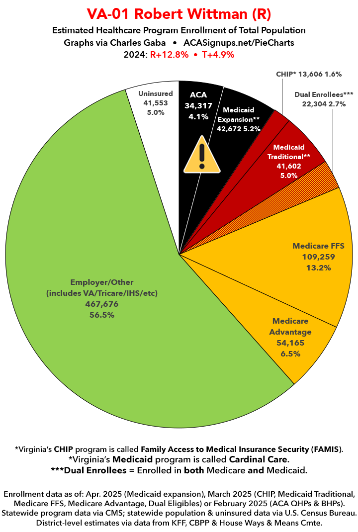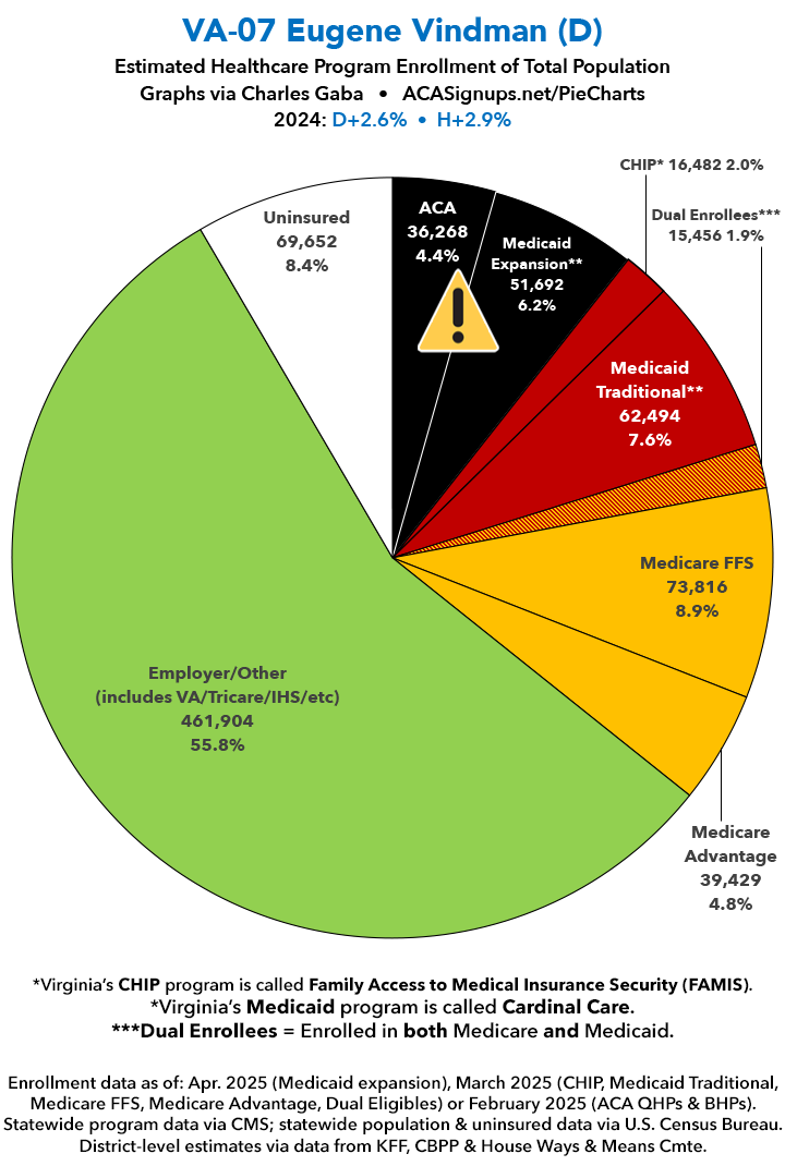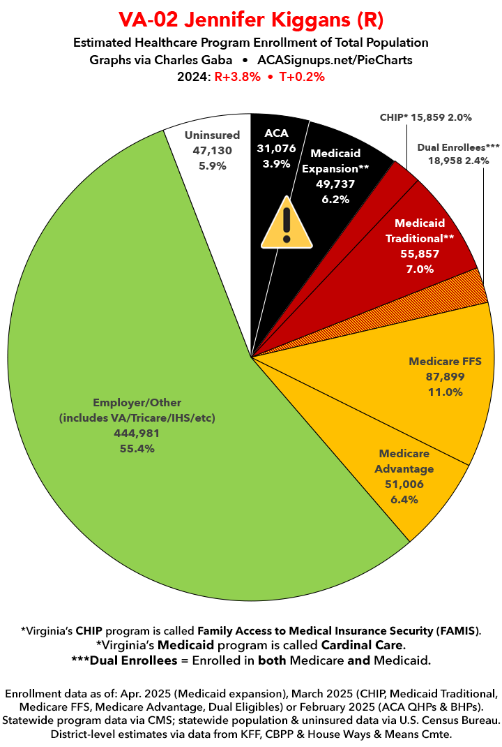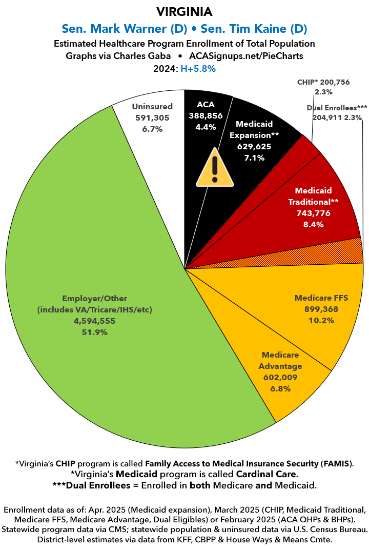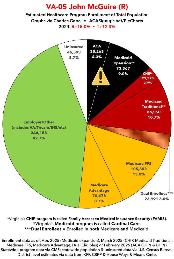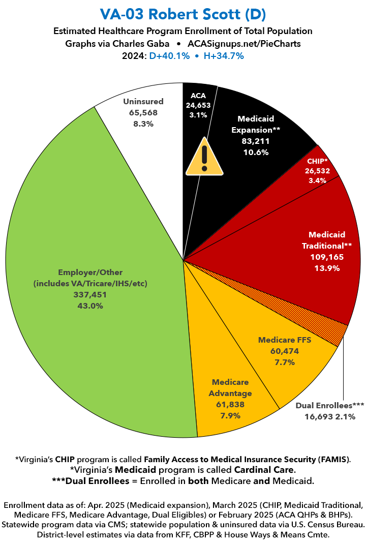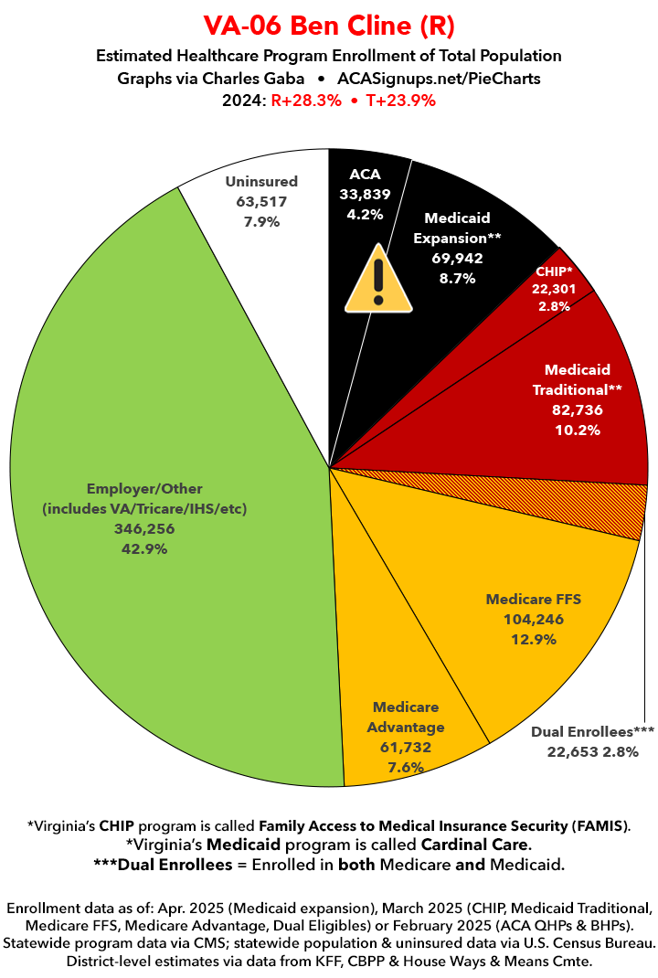 UPDATE 7/15/25: I've updated the web versions of the graphics with the most up-to-date enrollment data I have access to. The black sections w/the ⚠️ symbol are those most at risk of losing healthcare coverage due to H.R. 1, the "One Big Beautiful Bill Act" (aka the #MAGAMurderBill).