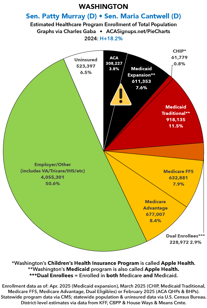 UPDATE 7/15/25: I've updated the web versions of the graphics with the most up-to-date enrollment data I have access to. The black sections w/the ⚠️ symbol are those most at risk of losing healthcare coverage due to H.R. 1, the "One Big Beautiful Bill Act" (aka the #MAGAMurderBill).​​​​​