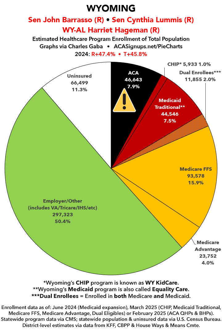 UPDATE 7/16/25: I've updated the web versions of the graphics with the most up-to-date enrollment data I have access to. The black sections w/the ⚠️ symbol are those most at risk of losing healthcare coverage due to H.R. 1, the "One Big Beautiful Bill Act" (aka the #MAGAMurderBill).
