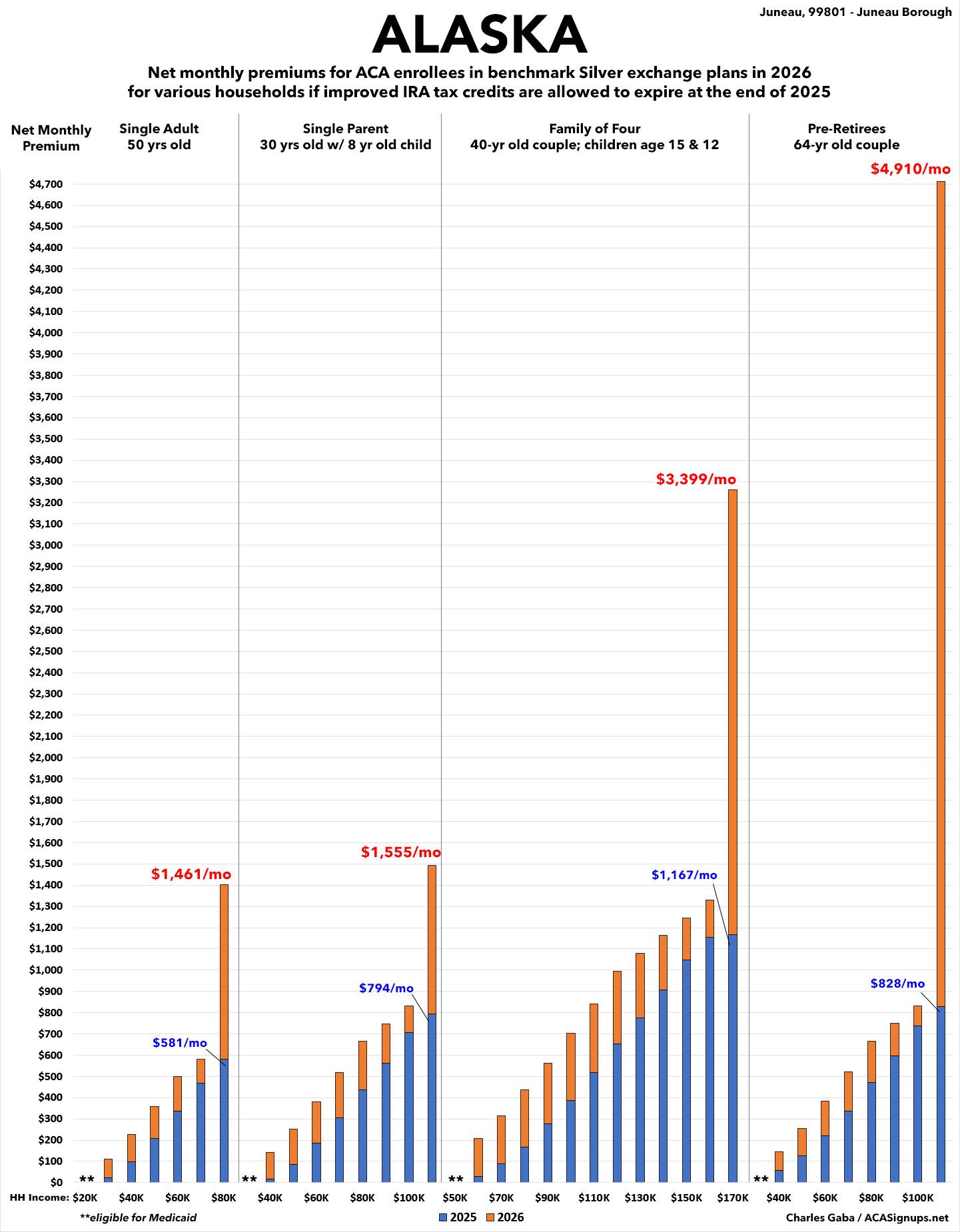 Benchmark Silver premiums vary widely depending on where you live & other factors. For Alaska I'm usuing Juneau.