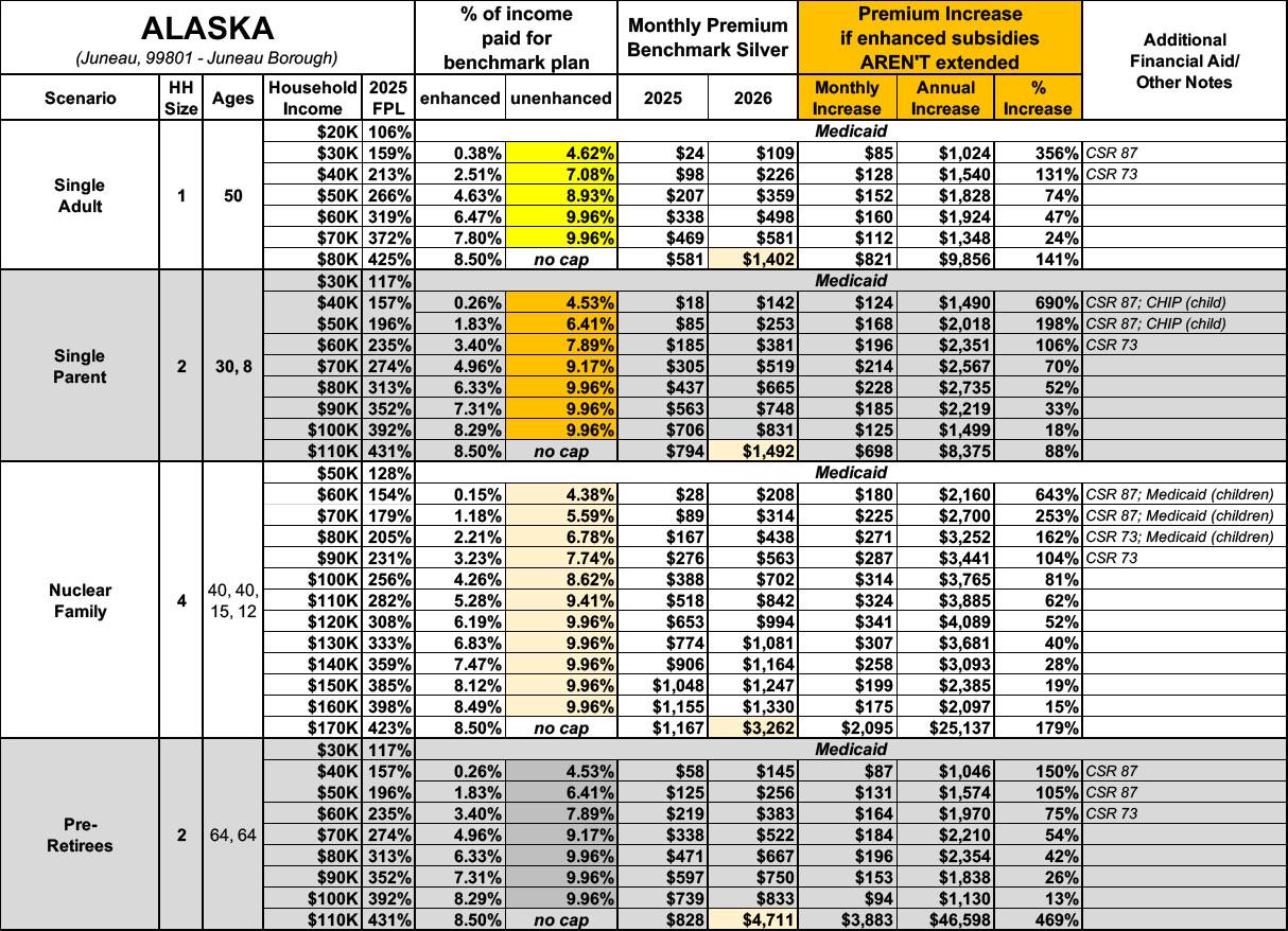 NEW: The original version of this analysis included a 4.3% increase in the unsubsidized benchmark plan premium based on a projection by the Congressional Budget Office. However, that was a national average projection. This updated version assumes the actual 2026 Alaska rate filings.
