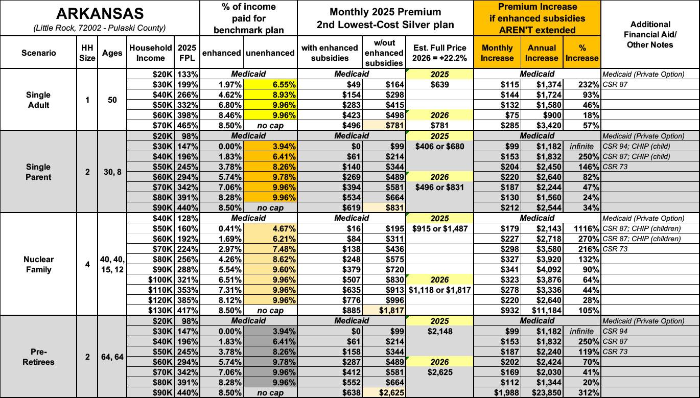 • The original version of this analysis included a 4.3% increase in the unsubsidized benchmark plan premium based on a projection by the Congressional Budget Office. However, that was a national average projection which didn’t take into account other factors like increased utilization, medical inflation and so on. This updated version assumes the actual 2026 Arkansas rate filings which average 35.7% statewide.