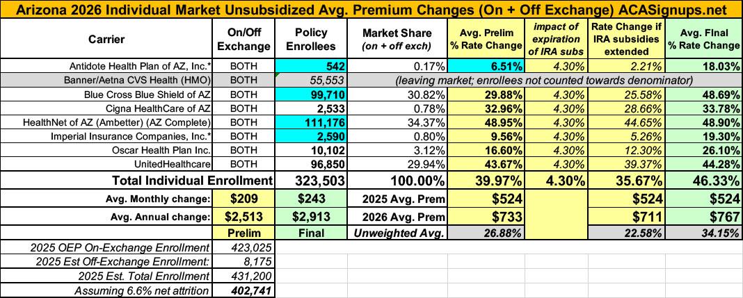 Arizona has around 423,000 residents enrolled in ACA exchange plans, 88% of whom are currently subsidized. I estimate they also have perhaps another ~8,000 unsubsidized off-exchange enrollees.