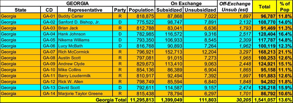 Georgia has around ~1.5 MILLION residents enrolled in ACA exchange plans, 93% of whom are currently subsidized. I estimate they also have another ~30,000 unsubsidized off-exchange enrollees.
