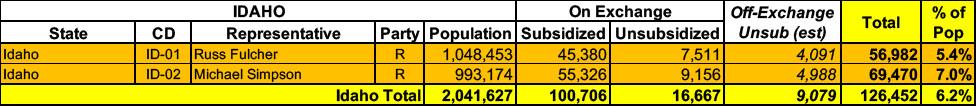 Idaho has around 117,000 residents enrolled in ACA exchange plans, 86% of whom are currently subsidized. I estimate they also have another ~9,000 unsubsidized off-exchange enrollees, although the actual rate filings (summarized later in this post) put the off-exchange total at a much higher ~47,000.