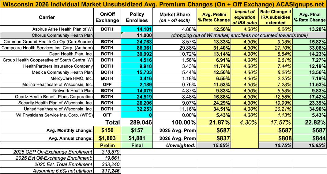 Wisconsin had 313,579 people enroll during the 2025 OEP, and based on the 2024 CMS liability risk score report, there should be another ~19,000 or so off-exchange enrollees, for a total of roughly 333,000. CMS also reported a national net attrition rate of 6.6% thru April; applying that gives a net total of roughly 311,000.