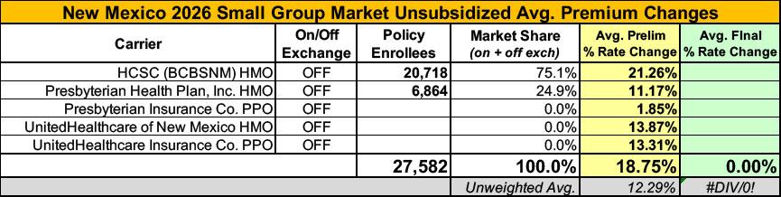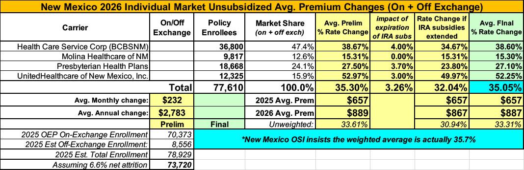 UPDATE 8/29/25: The New Mexico Office of Superintendent of Insurance (OSI) has issued a press release stating that they've approved the rate filings for all 4 individual market carriers with a weighted average increase of 35.7% (slightly higher than the preliminary 35.3%). From what I can tell the actual weighted average of the approved filings is slightly lower at 35.1%, but I'll have to go with NM OSI as the final word: