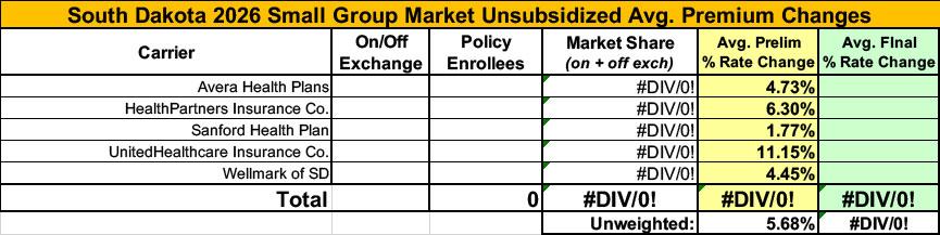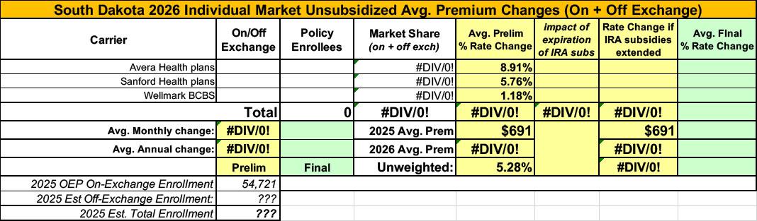 UPDATE 8/29/25: South Dakota's 3 individual market carriers have published their final/approved rate filings (see links below). All three were approved as is, but all of them also include the actual enrollment numbers, so I'm able to run a properly weighted average.