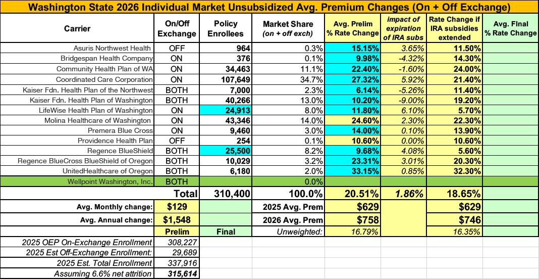 2026 Final Gross Rate Changes - Washington: +21% avg; ~305,000 enrollees are in for a hell of a shock this fall (updated)